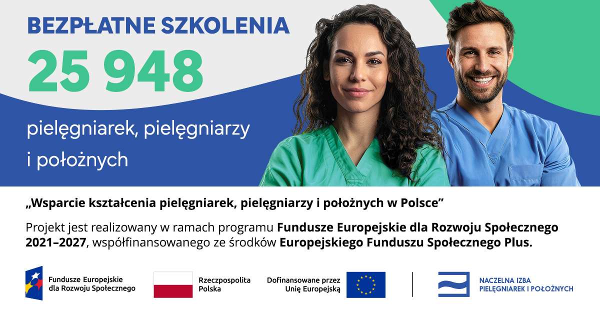 📚 Kursy realizowane są w ramach projektu „Wsparcie kształcenia pielęgniarek, pielęgniarzy i położnych w Polsce”, współfinansowanego ze środków Europejskiego Funduszu Społecznego Plus, w programie Fundusze Europejskie dla Rozwoju Społecznego 2021–2027.