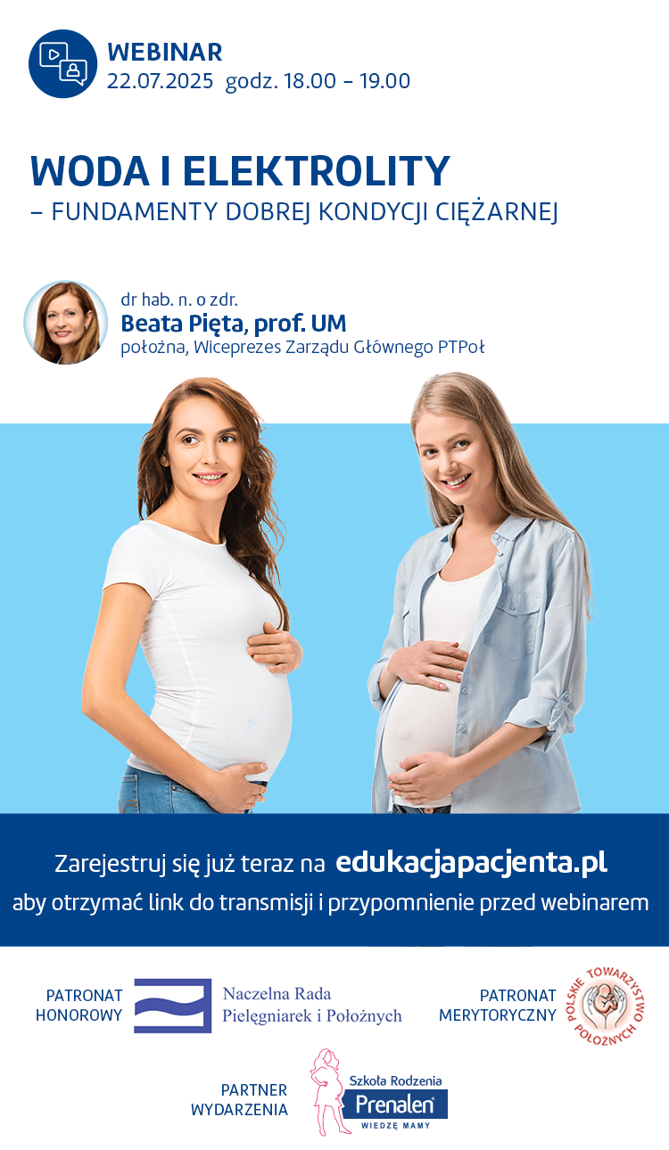 Zaproszenie na bezpłatny webinar: Woda i elektrolity – fundamenty dobrej kondycji ciężarnej. Webinar odbędzie się 22.07.2025 o godzinie 18.00. W webinarze udział weźmie dr hab. n. o zdr. Beata Pięta, prof. UM położna, Wiceprezes Zarządu Głównego PTPoł.Patronat honorowy nad wydarzeniem…