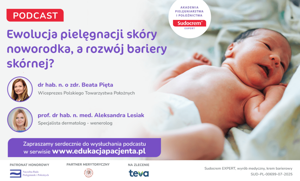 Bezpłatny podcast: Ewolucja pielęgnacji skóry noworodka, a rozwój bariery skórnej? Patronat honorowy nad wydarzeniem objęła Naczelna Rada Pielęgniarek i Położnych, patronat merytoryczny Polskiego Towarzystwa Położnych. W podcaście udział wzięły dr hab. n. o zdr. Beata Pięta, Wiceprezes Polskiego Towarzystwa Położnych oraz prof. dr hab. n. med. Aleksandra Lesiak, specjalista dermatolog.