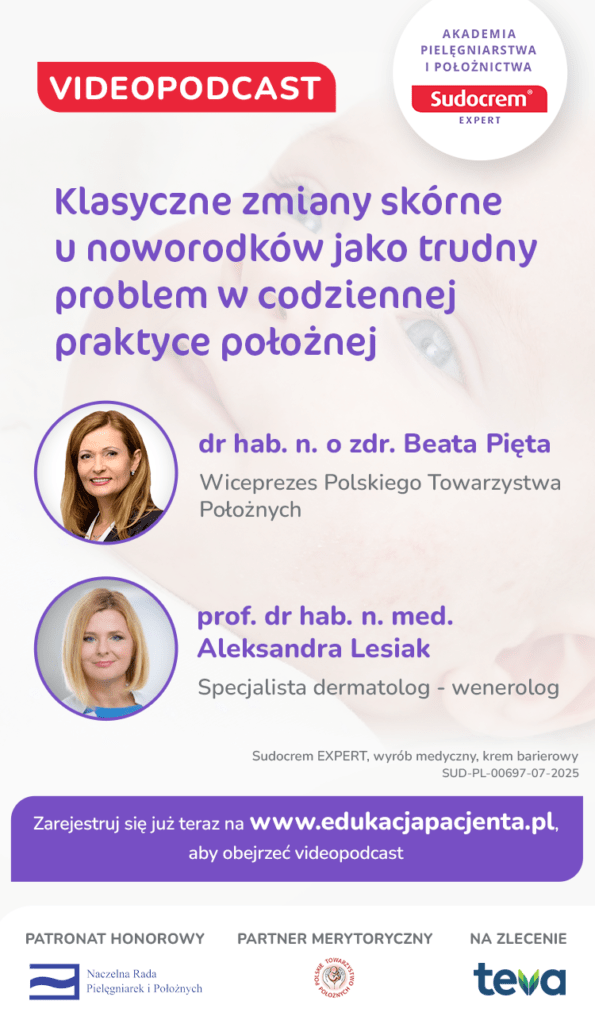 Videopodcast: Klasyczne zmiany skórne u noworodków jako trudny problem w codziennej praktyce położnej. Patronat honorowy nad wydarzeniem objęła Naczelna Rada Pielęgniarek i Położnych, patronat merytoryczny Polskiego Towarzystwa Położnych. W videopodcaście udział wzięły dr hab. n. o zdr. Beata Pięta Wiceprezes Polskiego Towarzystwa Położnych oraz prof. dr hab. n. med. Aleksandra Lesiak, specjalista dermatolog – wenerolog