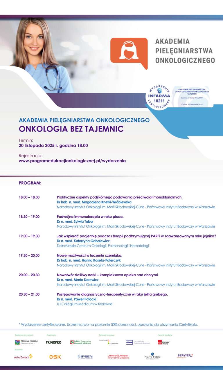 Szanowni Państwo,w imieniu Polskiego Towarzystwa Onkologii Klinicznej – organizatora Programu Edukacji Onkologicznej, w ramach którego działa Akademia Pielęgniarstwa Onkologicznego – serdecznie zapraszamy do bezpłatnego udziału w webinarium: „ONKOLOGIA BEZ TAJEMNIC”. Szkolenie odbędzie się w dniu 20 listopada br. o godzinie 18.00. Wydarzenie…