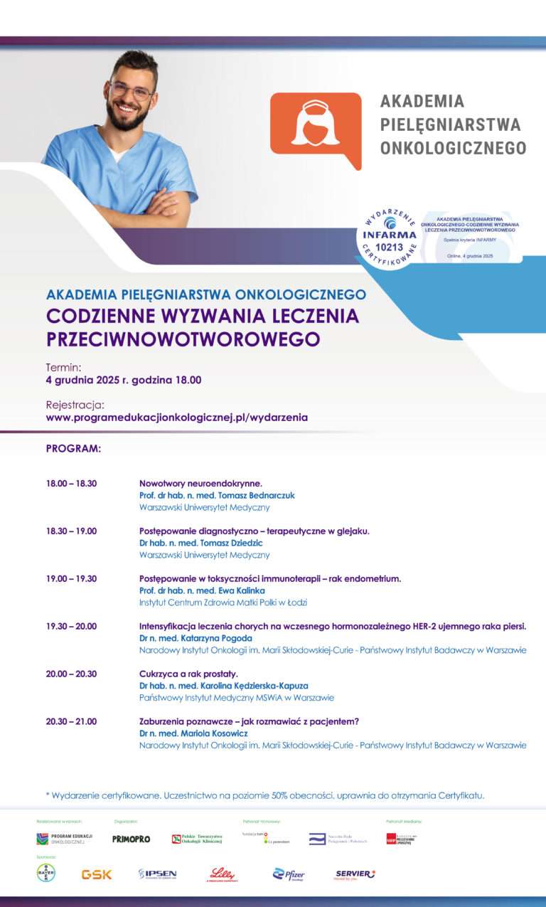 Szanowni Państwo, w imieniu Polskiego Towarzystwa Onkologii Klinicznej – organizatora Programu Edukacji Onkologicznej, w ramach którego działa Akademia Pielęgniarstwa Onkologicznego – serdecznie zapraszamy do bezpłatnego udziału w webinarium: „CODZIENNE WYZWANIA LECZENIA PRZECIWNOWOTWOROWEGO” Szkolenie odbędzie się w dniu 4 grudnia br.…