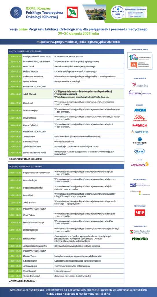w imieniu Polskiego Towarzystwa Onkologii Klinicznej – organizatora Programu Edukacji Onkologicznej, w ramach którego działa Akademia Pielęgniarstwa Onkologicznego – serdecznie zapraszamy do bezpłatnego udziału w dwudniowej sesji dla pielęgniarek i personelu medycznego, która odbędzie się w dniach 29-30 sierpnia br. podczas XXVIII Kongresu Polskiego Towarzystwa Onkologii Klinicznej.
