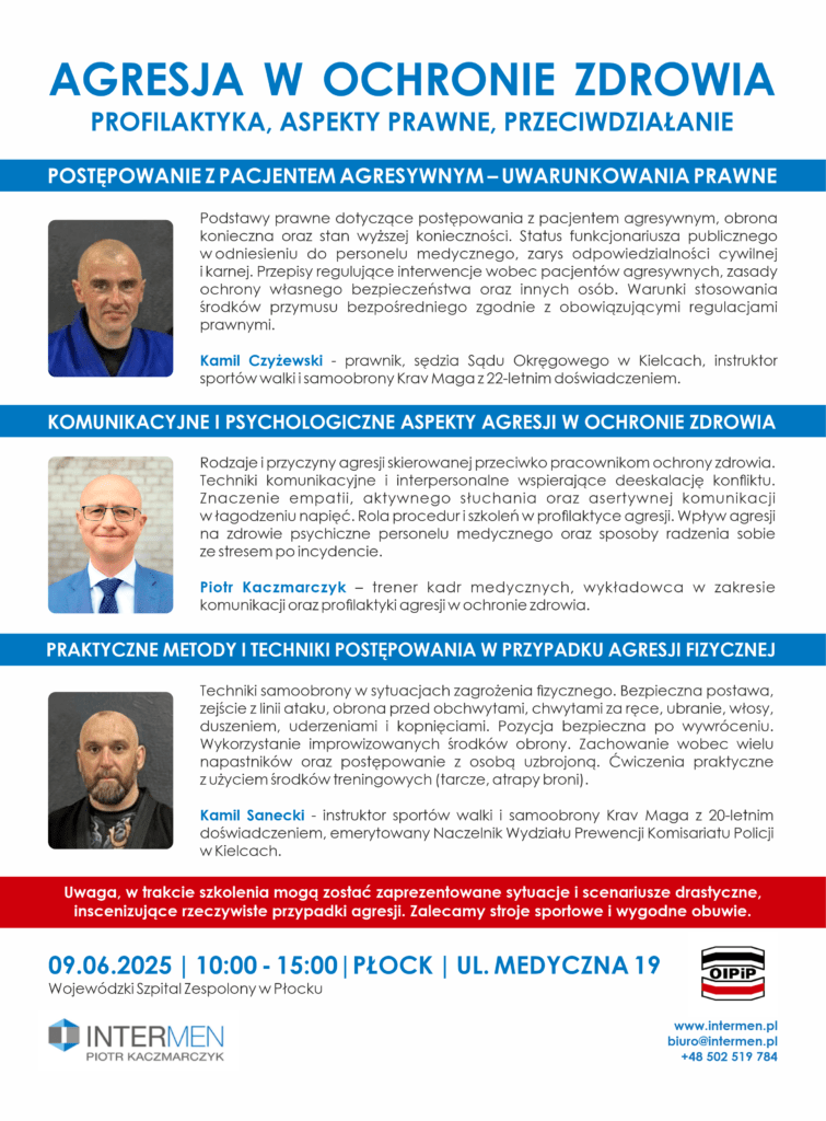 Okręgowa Izba Pielęgniarek i Położnych Regionu Płockiego zaprasza na bezpłatne szkolenie pt. „Agresja w ochronie zdrowia. Profilaktyka, aspekty prawne, przeciwdziałanie”.
