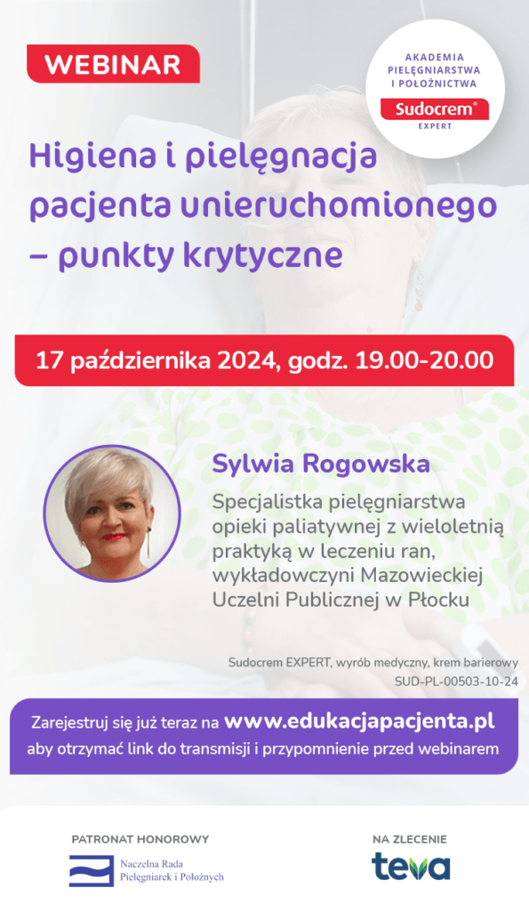 Higiena i Pielęgnacja pacjenta unieruchomionego – punkty krytyczne. Webinar jest zaplanowany na 17 października 2024 godzina 19.00.Patronat honorowy nad wydarzeniem objęła Naczelna Rada Pielęgniarek i Położnych. W webinarze weźmie udział Pani Sylwia Rogowska Specjalistka pielęgniarstwa opieki paliatywnej, wykładowczyni Mazowieckiej Uczelni Publicznej w Płocku.