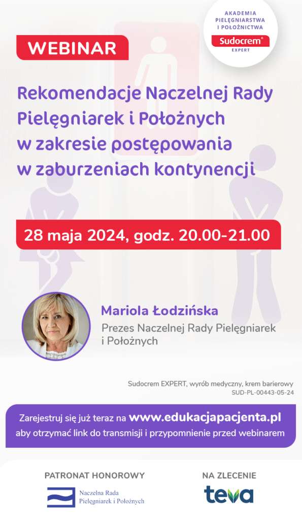 Serdecznie zapraszamy na webinar, podczas którego przedstawimy rekomendacje NRPiP w zakresie postępowania przy zaburzeniach kontynencji. Rekomendacje te stanowią nieocenione narzędzie przy diagnozowaniu potrzeb pacjentów oraz podejmowaniu decyzji terapeutycznych, zgodnie z ich oczekiwaniami. Stosowanie rekomendacji pozwala pielęgniarkom na skuteczne wsparcie i aktywizację pacjentów oraz ich rodzin, dążąc do wspólnego celu – samodzielności pacjenta i poprawy jakości jego życia. Dołącz do nas, aby dowiedzieć się więcej i podnieść swoje kwalifikacje zawodowe!